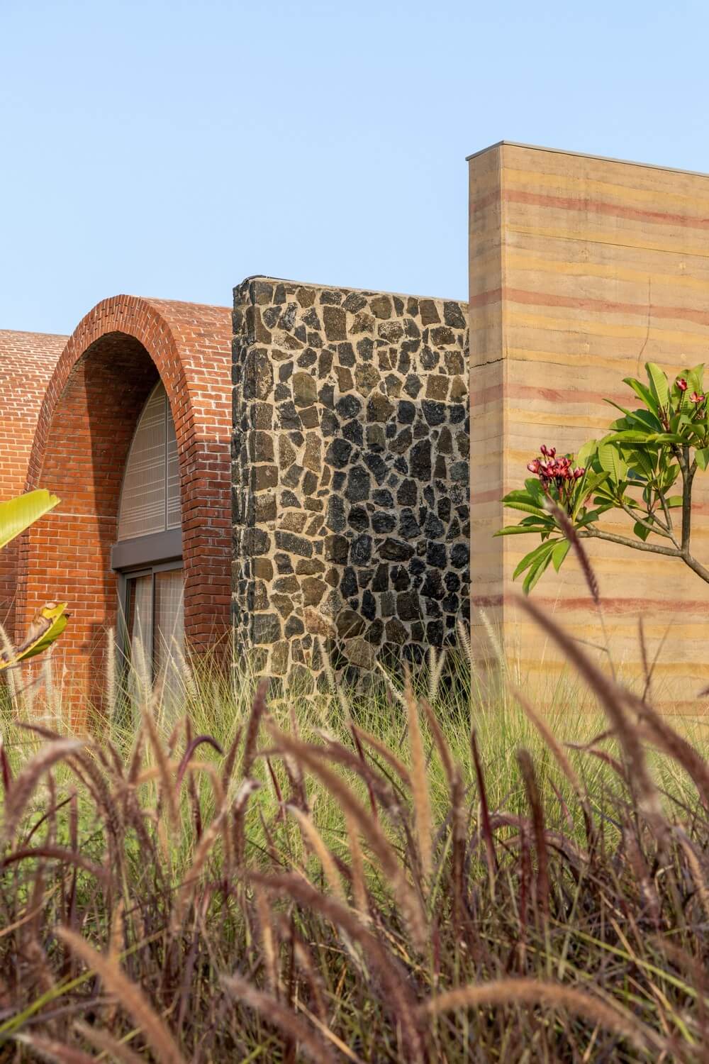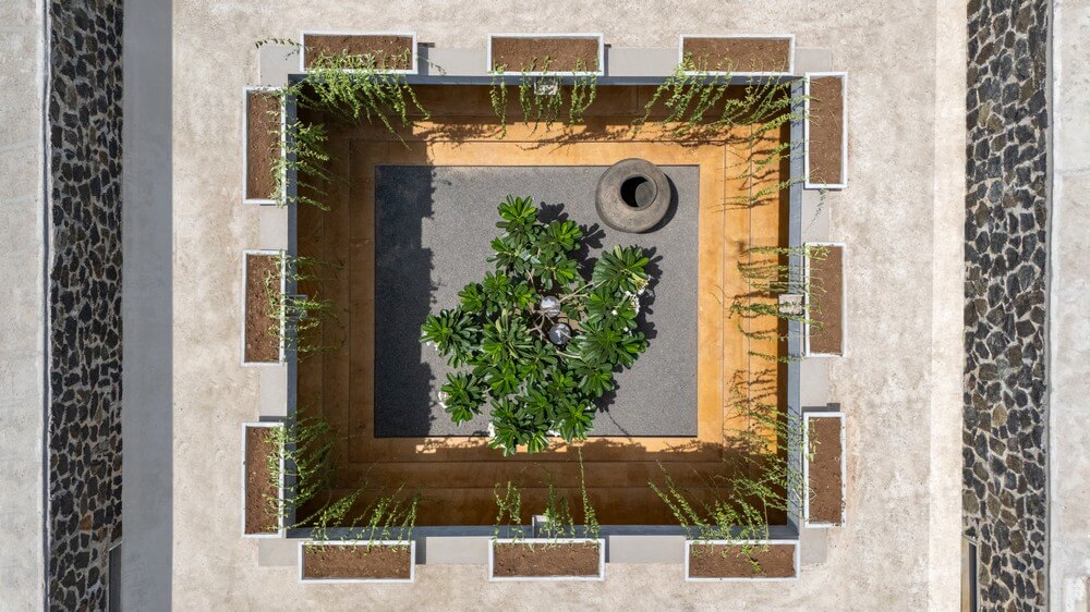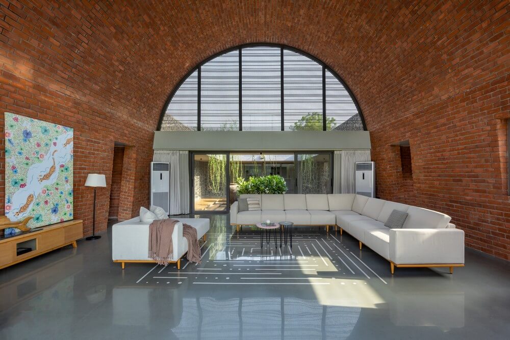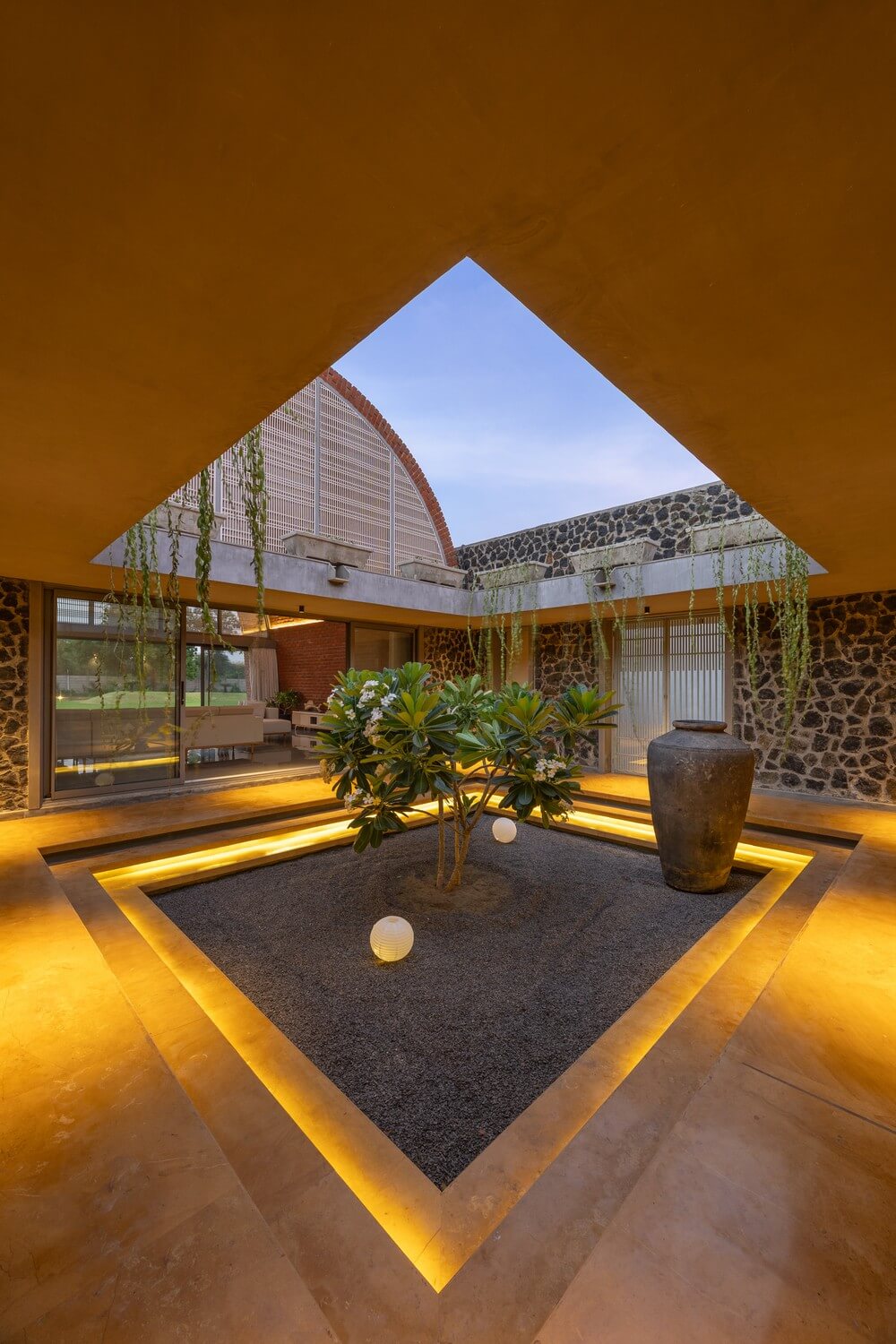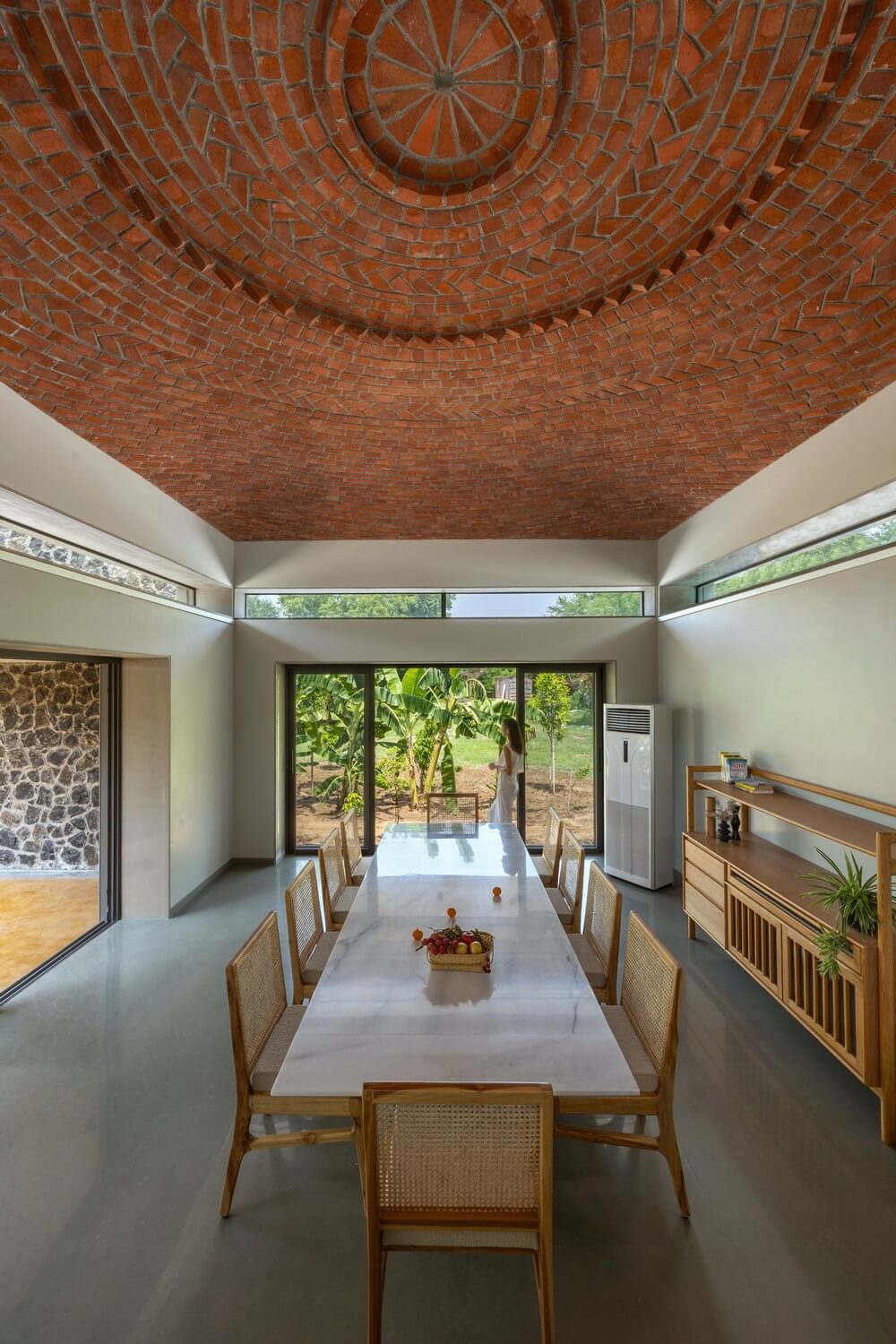 The architectural composition showcases a harmonious fusion of natural elements such as rammed earth, brick, stone, and wood, harmonized with contemporary features like sleek lines, precise geometry, and glass panels. Intertwining greenery and water elements deepen the connection between the constructed environment and the surrounding natural panorama. Covered walkways, patios, and decks serve as transitional spaces, extending the indoors outward and beckoning nature indoors. The grand vaults, spanning 8 meters, are self-supporting structures without any internal reinforcement or additional support. The lofty, arched ceilings and open central court evoke a feeling of grandeur and spatial distinction. Meanwhile, the use of natural materials and minimalist design elements fosters a serene and organic atmosphere. The open layout facilitates a smooth transition from inside to outside, with the courtyard seamlessly blending with the interior living space, creating a unified, expansive environment.