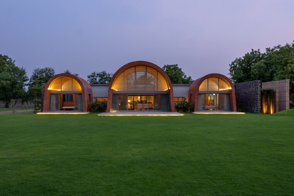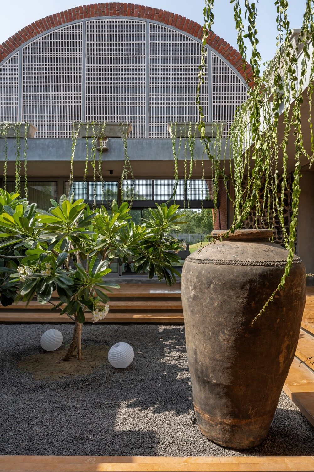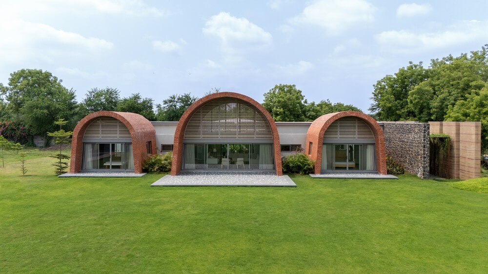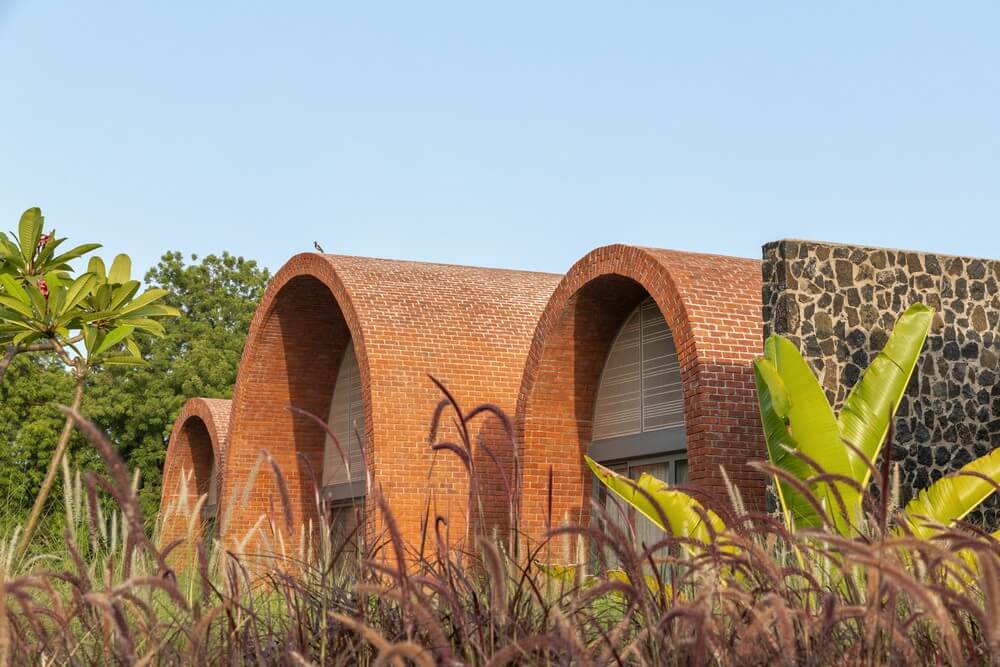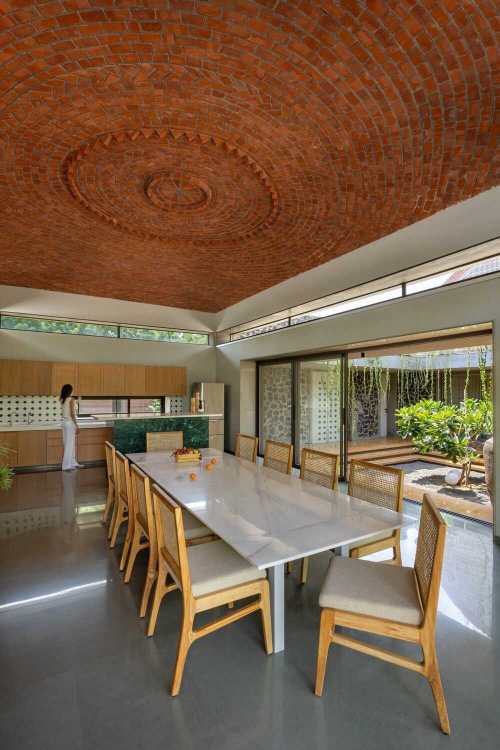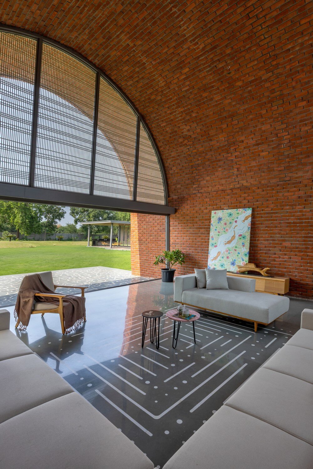 The architectural composition showcases a harmonious fusion of natural elements such as rammed earth, brick, stone, and wood, harmonized with contemporary features like sleek lines, precise geometry, and glass panels. Intertwining greenery and water elements deepen the connection between the constructed environment and the surrounding natural panorama. Covered walkways, patios, and decks serve as transitional spaces, extending the indoors outward and beckoning nature indoors. The grand vaults, spanning 8 meters, are self-supporting structures without any internal reinforcement or additional support. The lofty, arched ceilings and open central court evoke a feeling of grandeur and spatial distinction. Meanwhile, the use of natural materials and minimalist design elements fosters a serene and organic atmosphere. The open layout facilitates a smooth transition from inside to outside, with the courtyard seamlessly blending with the interior living space, creating a unified, expansive environment.