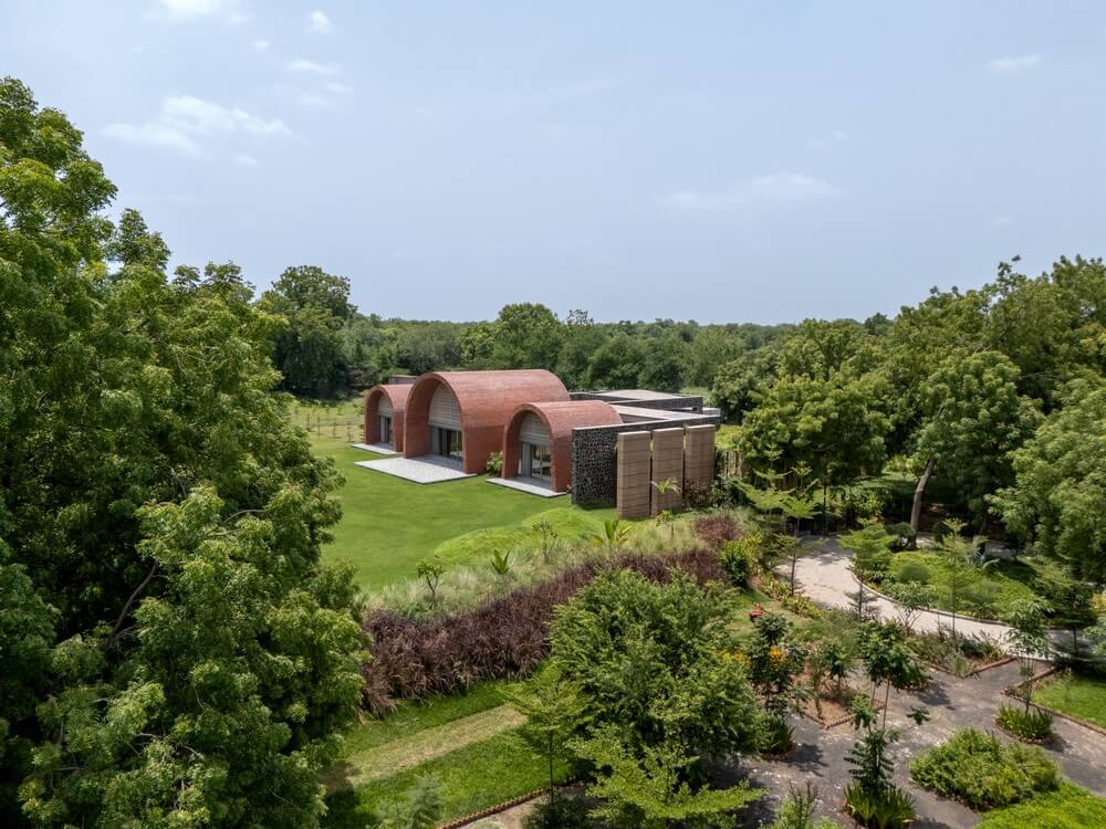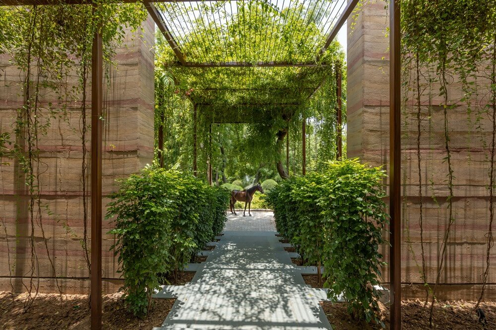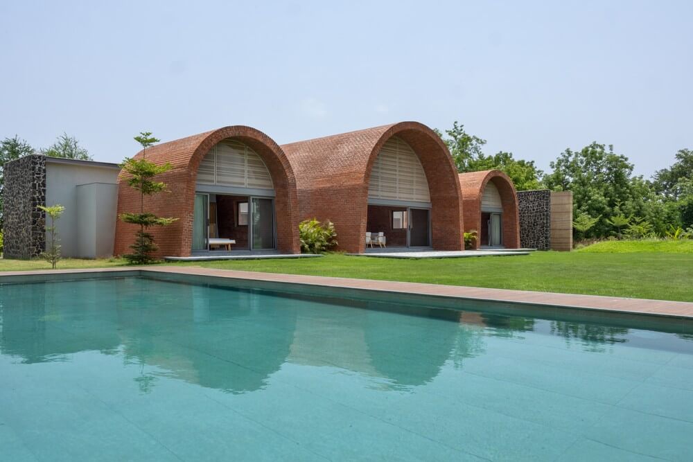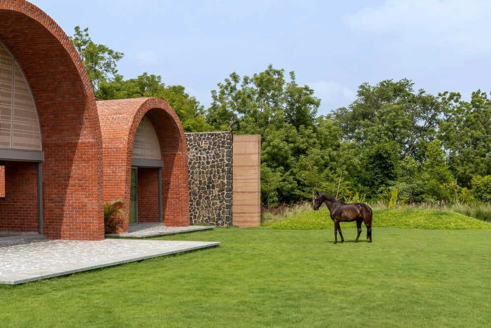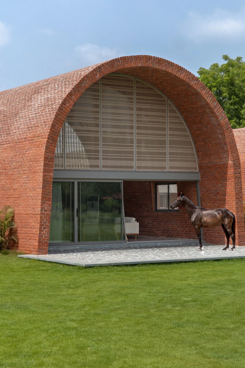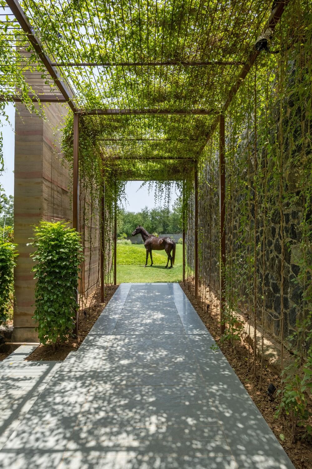 The architectural composition showcases a harmonious fusion of natural elements such as rammed earth, brick, stone, and wood, harmonized with contemporary features like sleek lines, precise geometry, and glass panels. Intertwining greenery and water elements deepen the connection between the constructed environment and the surrounding natural panorama. Covered walkways, patios, and decks serve as transitional spaces, extending the indoors outward and beckoning nature indoors. The grand vaults, spanning 8 meters, are self-supporting structures without any internal reinforcement or additional support. The lofty, arched ceilings and open central court evoke a feeling of grandeur and spatial distinction. Meanwhile, the use of natural materials and minimalist design elements fosters a serene and organic atmosphere. The open layout facilitates a smooth transition from inside to outside, with the courtyard seamlessly blending with the interior living space, creating a unified, expansive environment.