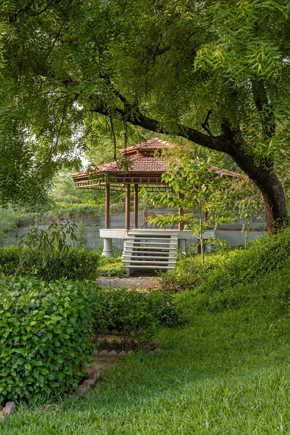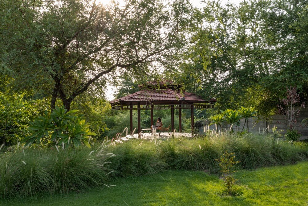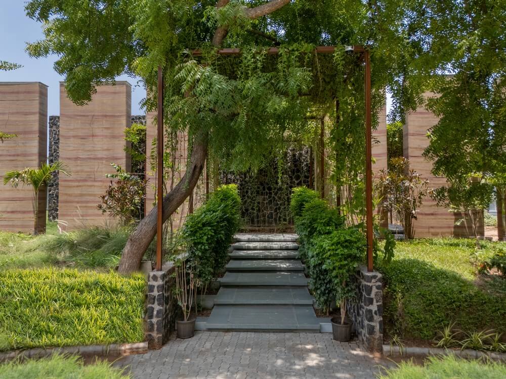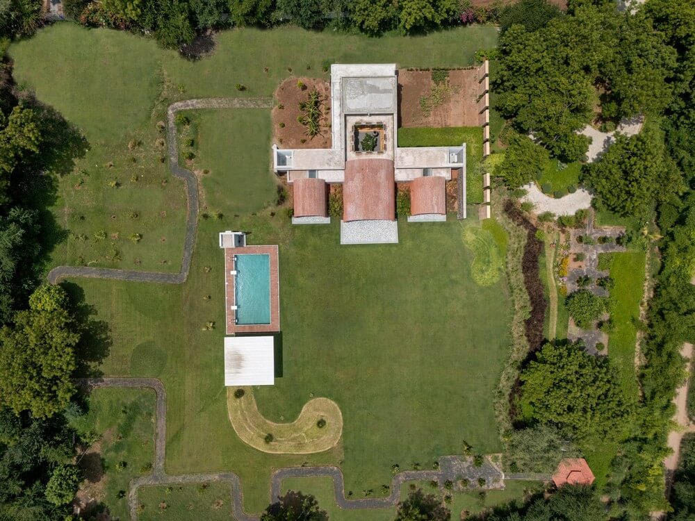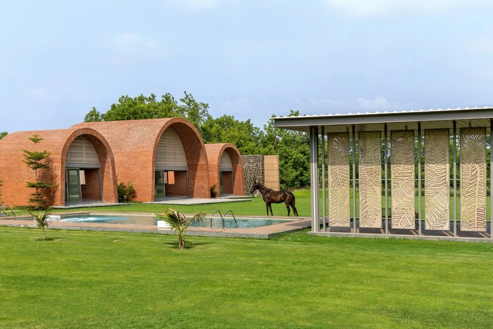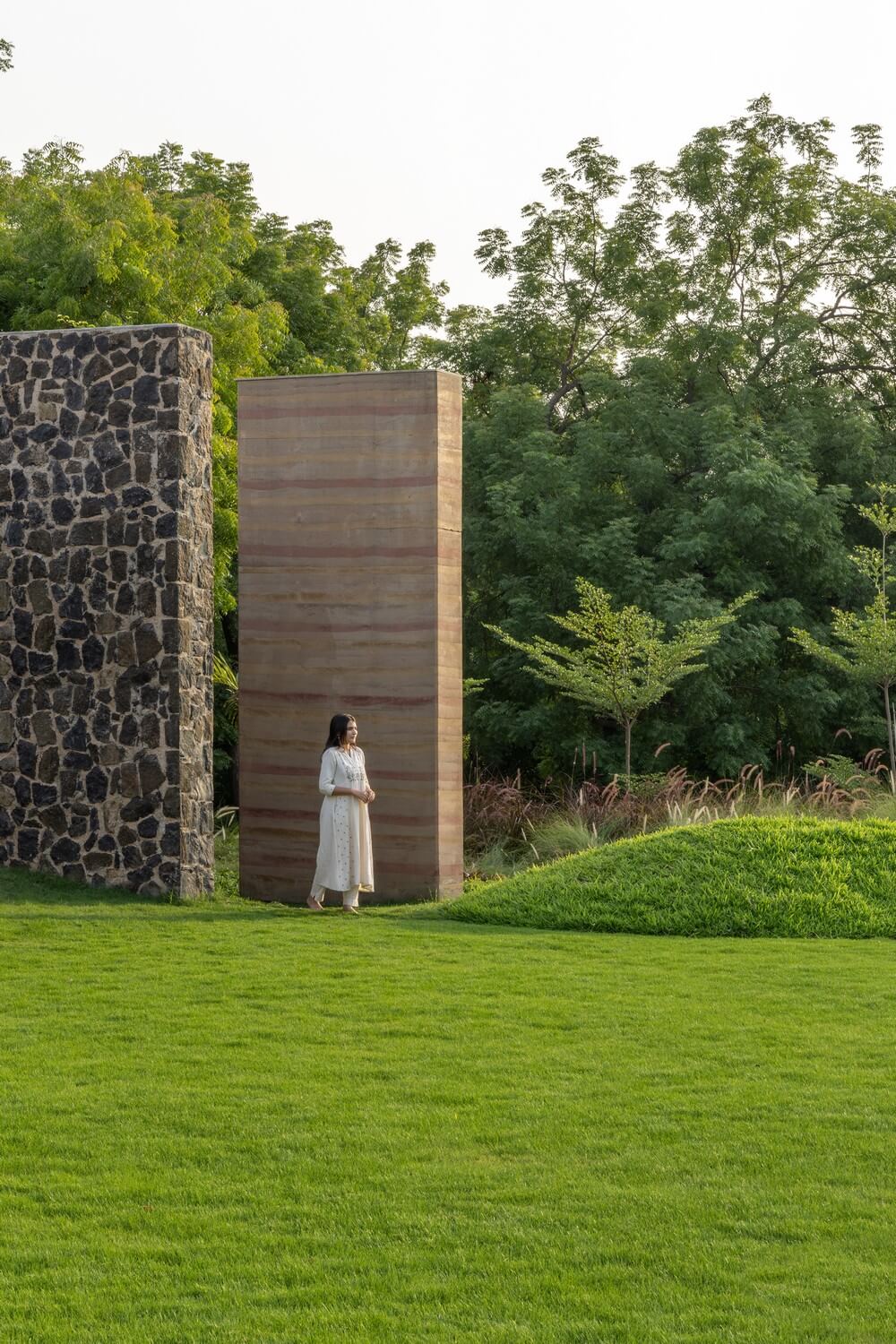 The architectural composition showcases a harmonious fusion of natural elements such as rammed earth, brick, stone, and wood, harmonized with contemporary features like sleek lines, precise geometry, and glass panels. Intertwining greenery and water elements deepen the connection between the constructed environment and the surrounding natural panorama. Covered walkways, patios, and decks serve as transitional spaces, extending the indoors outward and beckoning nature indoors. The grand vaults, spanning 8 meters, are self-supporting structures without any internal reinforcement or additional support. The lofty, arched ceilings and open central court evoke a feeling of grandeur and spatial distinction. Meanwhile, the use of natural materials and minimalist design elements fosters a serene and organic atmosphere. The open layout facilitates a smooth transition from inside to outside, with the courtyard seamlessly blending with the interior living space, creating a unified, expansive environment.